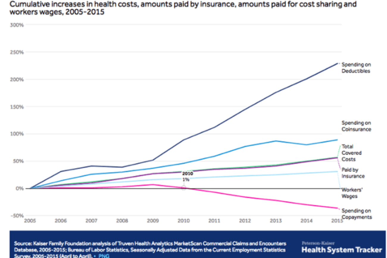 What’s worse? The average overall portion of patient cost sharing rose 66% from $469 in 2005 to $778 in 2015. During that same period, payments by health plans rose only 56%, reflecting a modest decrease in the generosity of insurance plans. Meanwhile, wages only rose by 31% from 2005-2015. So employees now have more financial responsibility for the cost of care, and less money to spend on it relative to the increases.